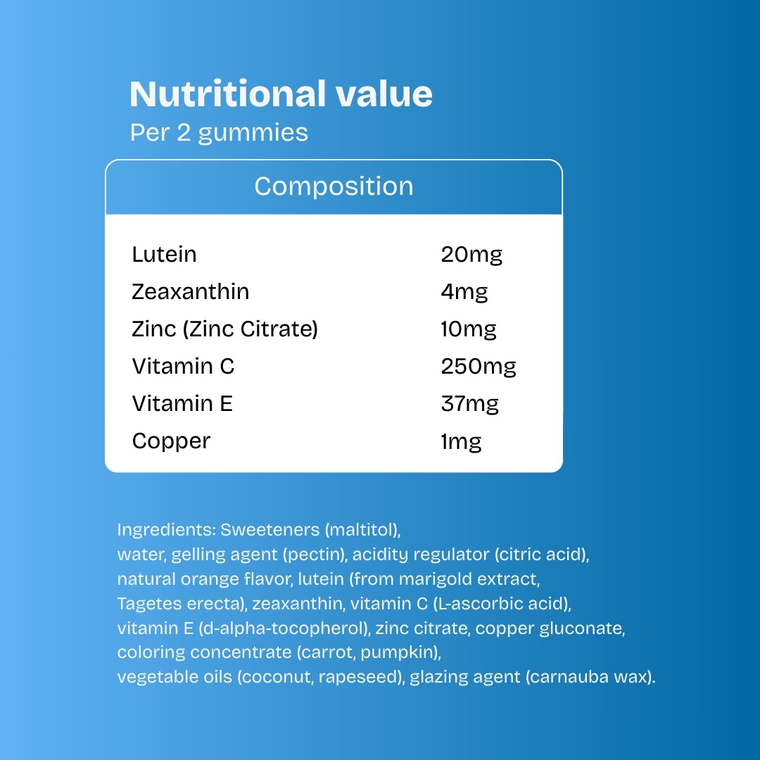 Elke gummy bevat een doeltreffende combinatie van 10 mg luteïne en 2 mg zeaxanthine – twee krachtige antioxidanten die van nature in het netvlies voorkomen.